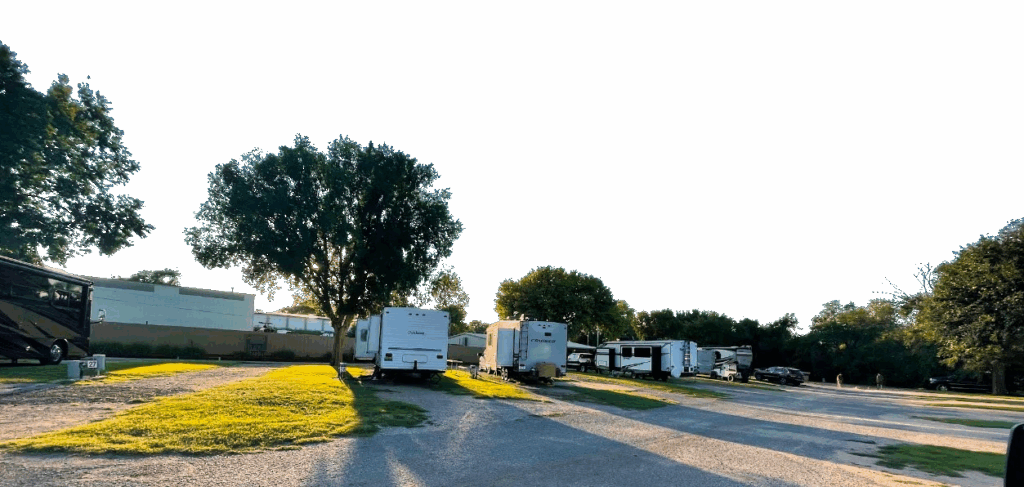 A: Our pull-thru sites are 21’ x 65’, big-rig friendly, and have room for slideouts. Back-in sites are 21’ x 60’.